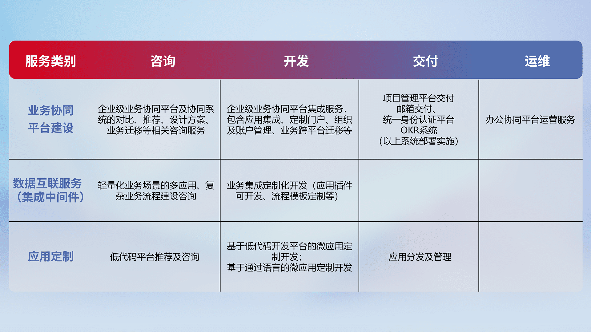 针对钉钉、、、、企微、、、IDaas等平台级产品提供产品的规划、、方案、、、、交付、、定制化开发等服务,,,实现如统一协同办公、、智能客户服务、、混合会议管理、、智能数据查询、、、等业务场景,,,,实现数字化转型。。。。