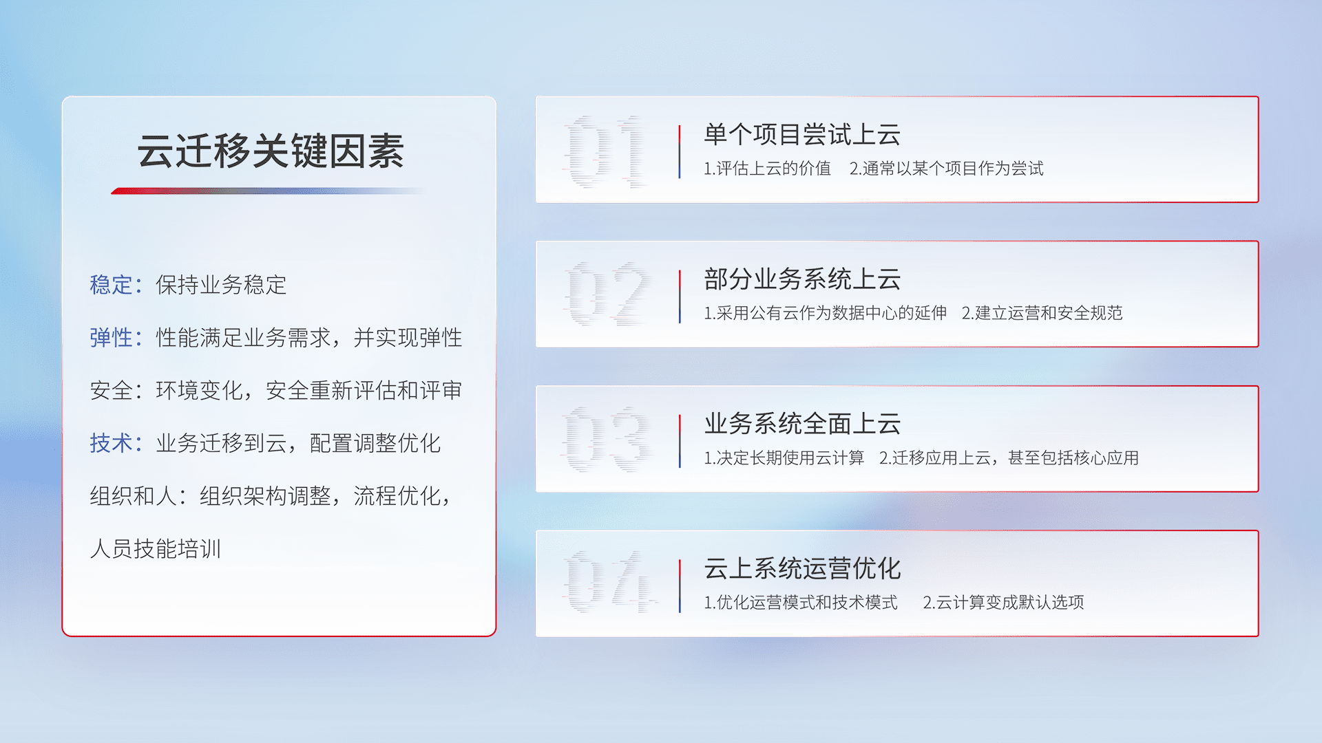 结合实际业务,,从规划设计、、云平台选型、、云原生改造、、、数据迁移、、、、集成交付,,迁移全过程为客户识别最佳上云路径,,,,做好风险识别管理,,,,设计网络架构、、、、身份权限、、安全审计合规、、、、操作审计、、、日志审计、、、监控告警策略、、、、多站点容灾设计等,,,对云上基础设施进行整体规划,,,,提升IT治理水平,,以满足弹性、、、、高可用、、、、高性能的需求。。。。
