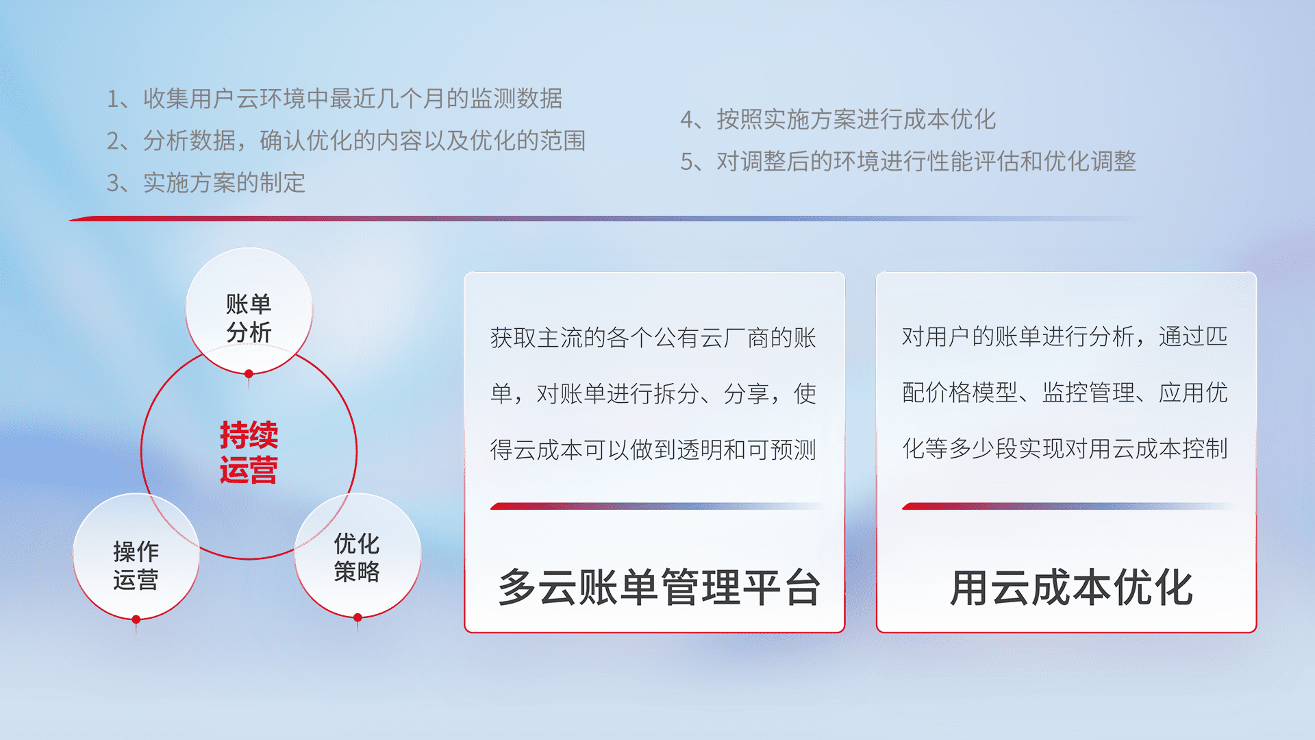 通过多云纳管,,以统一的资源数据模型把客户的云资源进行抽象和封装,,,,进而实现对多云资源的统一操作,,,保障云资源管理的可靠性、、、、稳定性与可用性。。。量身定制化运维内容,,,,配置、、开发运维、、、、补丁管理、、、、备份、、监控、、、、认证和访问管理、、、、审计和日常巡检等,,,,保障在用云过程中的可靠度,,稳定度以及高可用率。。